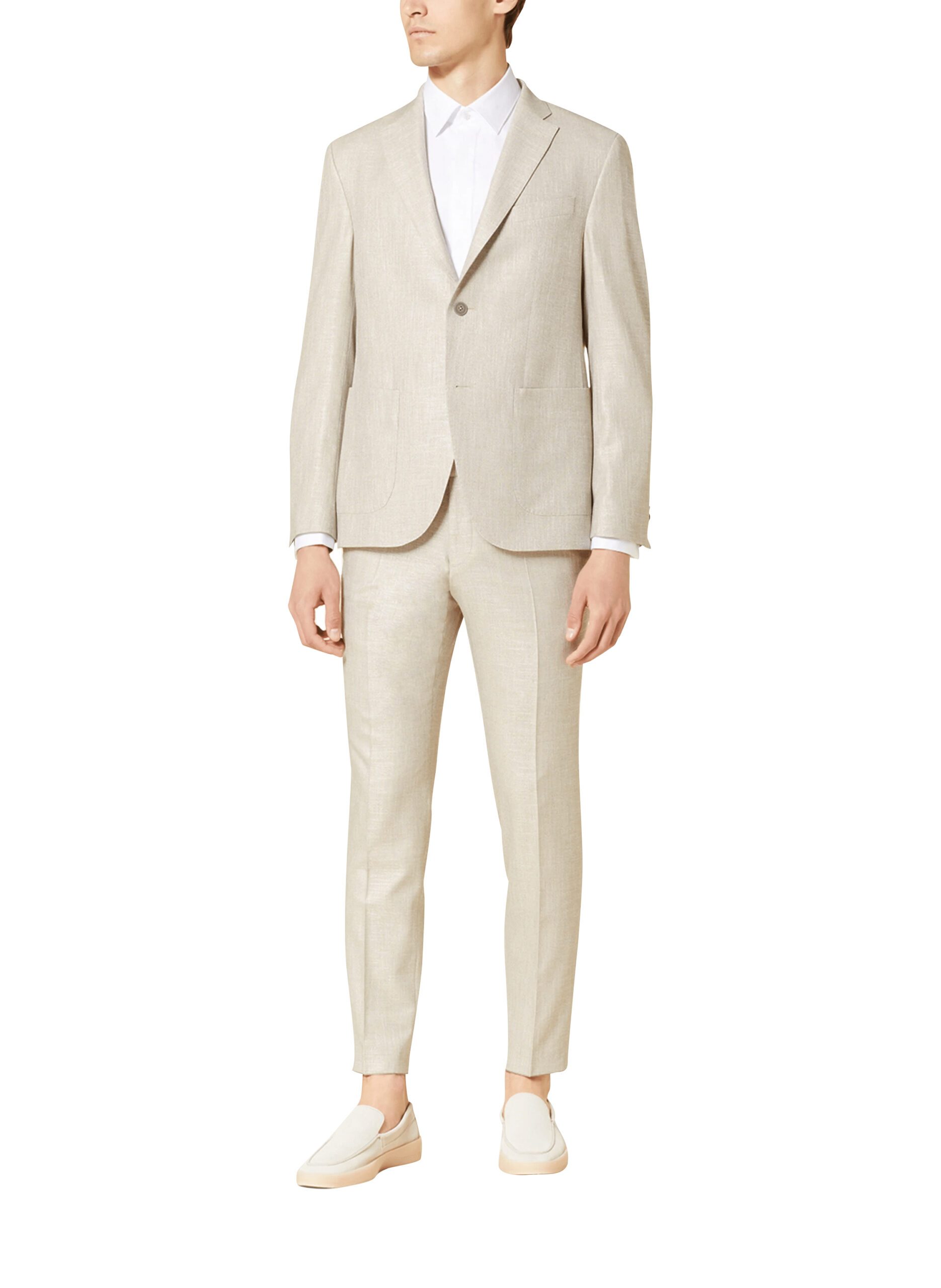Jacket details: Two-button, single-breasted, standard pockets, double vents, four-button sleeve cuffs