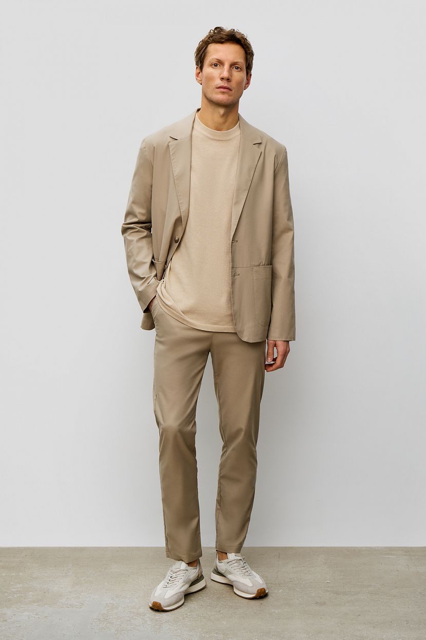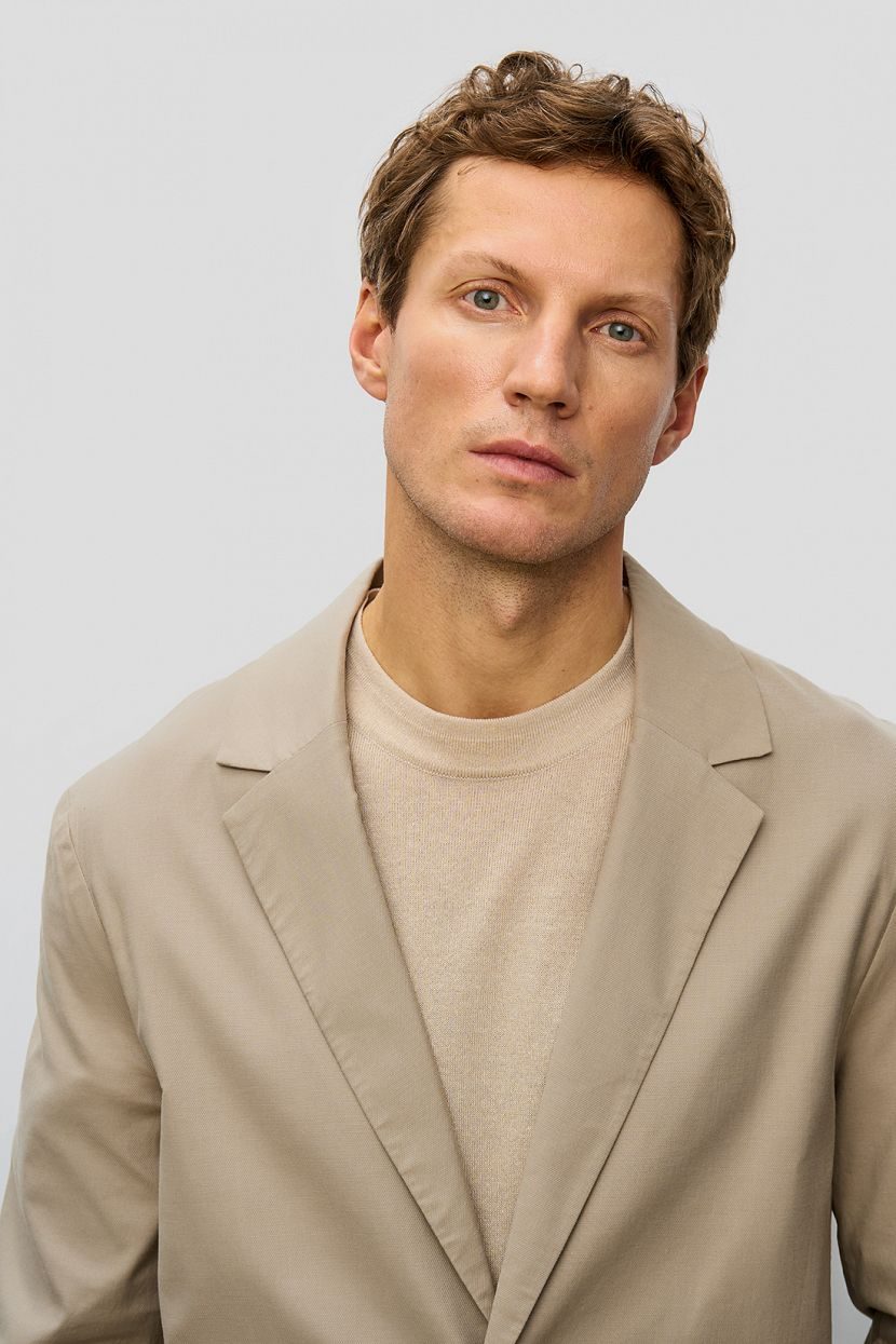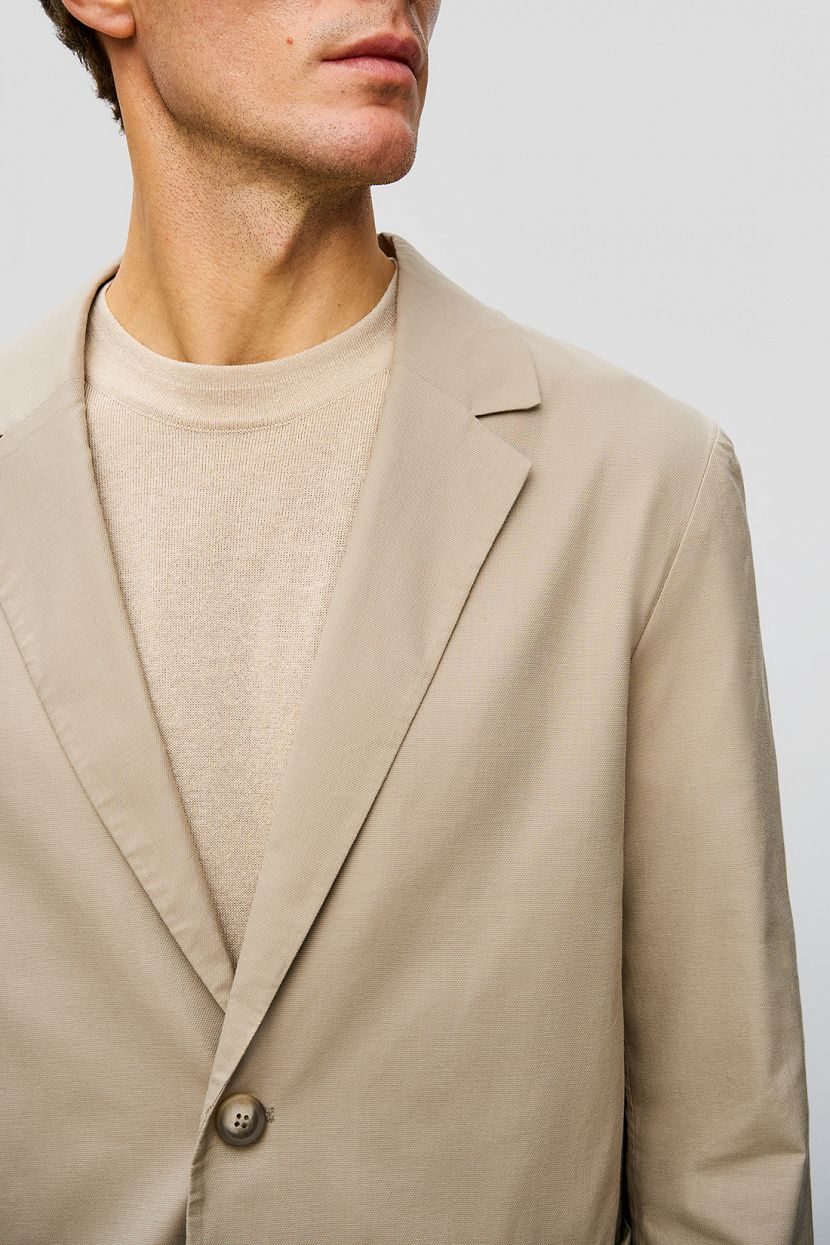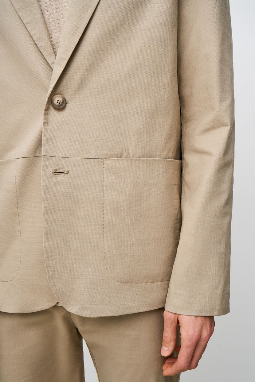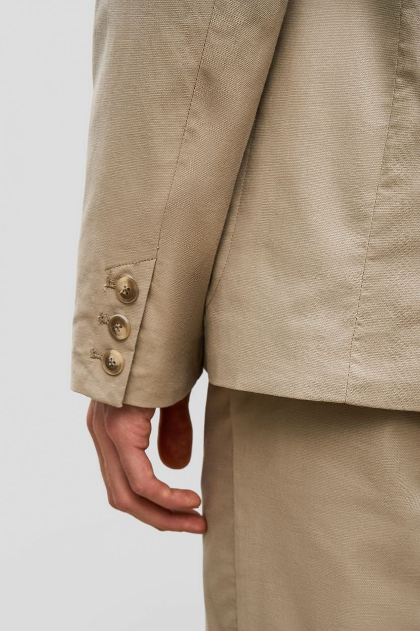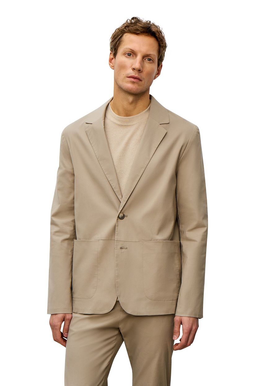 Front: Two-button, single-breasted jacket